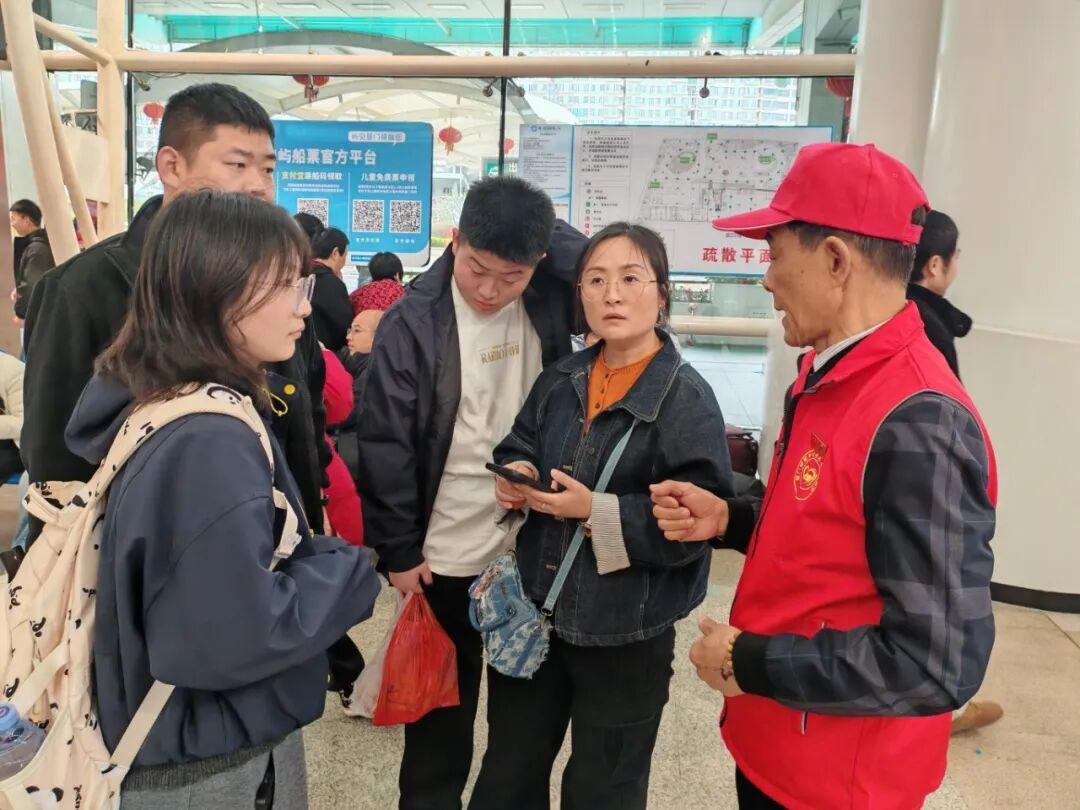 在熙熙攘攘的碼頭大廳 老兵們化身“活地圖”和“貼心人” 他們有的為游客指引方向、解答問詢 有的手把手地教旅客使用自助設備 解決購票、取票難題 還有的熱情為游客規劃出行路線