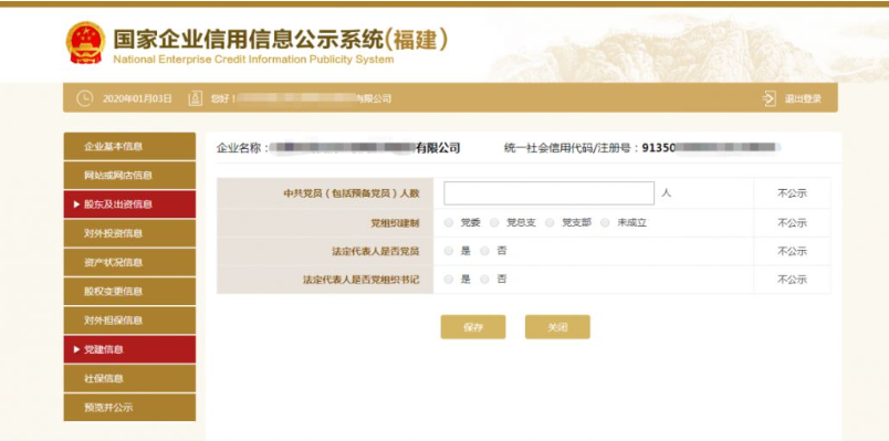 第十二步:填寫黨建信息。黨建信息為不公示信息,主要采集私營企業黨組織的建立情況,但屬于抽查范圍,請注意如實填寫。其中,中共黨員(包括預備黨員)人數,為截至年度報告年份12月31日的人數。如企業暫無黨員,填寫“0”人后點擊保存即可。