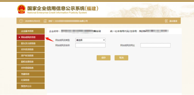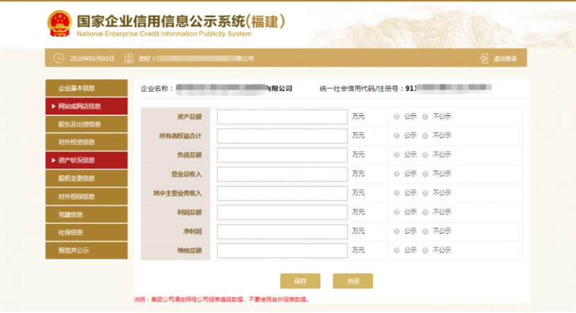 第五步:填寫基本信息。需要填報的通信地址、郵政編碼、聯系電話、電子郵箱、存續狀態、網址、網站信息均為報送時的信息,其余信息為所報告年度12月31日的信息。如果有網站、對外擔保,就點“是否有網站或網店”后面的“是”字前的圓點,如果沒有網站、對外擔保就點“否”字前的圓點。填寫完后點“保存”。