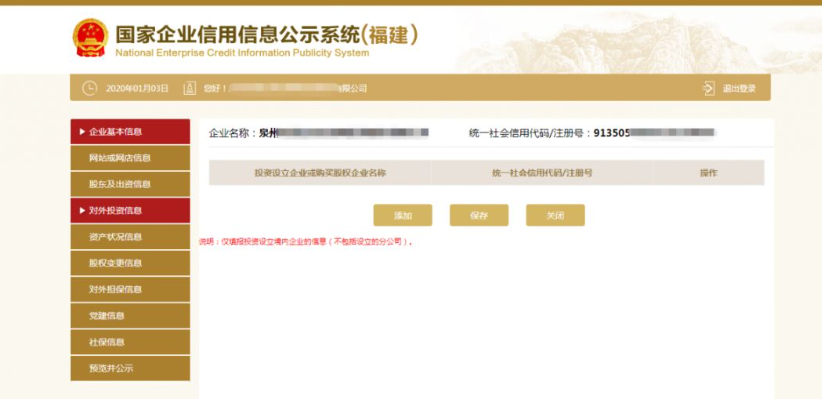 點擊頁面下方的“添加”按鈕,彈出添加股權變更信息頁面,填寫相應的信息,點擊“保存”按鈕,即可成功添加股權變更信息。如填寫信息需要修改,點擊“修改”,彈出修改頁面,修改相關信息。然后點擊“保存”按鈕,修改成功。最后再點擊“保存”按鈕,進入下一部分內容的填寫頁面。 第九步:填寫對外投資信息。點擊左邊的“對外投資信息”,之后再根據實際情況點擊“添加”填寫相關信息,填寫完成后點擊“保存”。如無對外投資情況的則無需填寫此項信息。