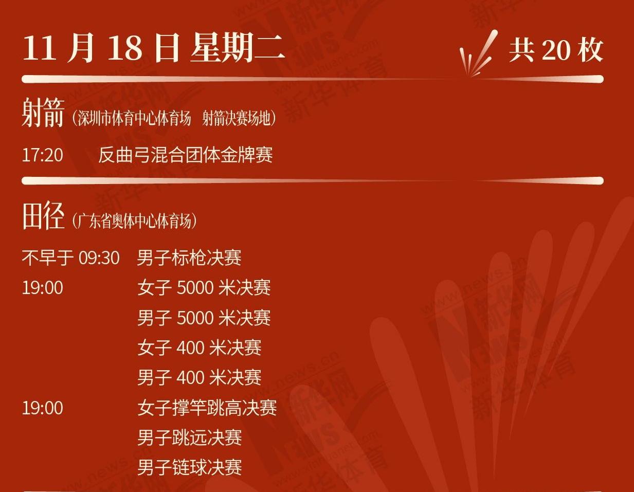 第十五屆全運(yùn)會,正在如火如荼進(jìn)行中。11月19日,運(yùn)動健兒將向多個(gè)項(xiàng)目發(fā)起獎牌沖擊,一起來看看賽程表。[詳細(xì)]